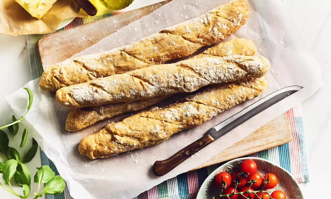 Preheat oven to 200°C/180°C/Gas mark 6 and place a baking tray filled with boiling water in the bottom of the oven – this creates steam in the oven and helps form the crust on the baguettes.