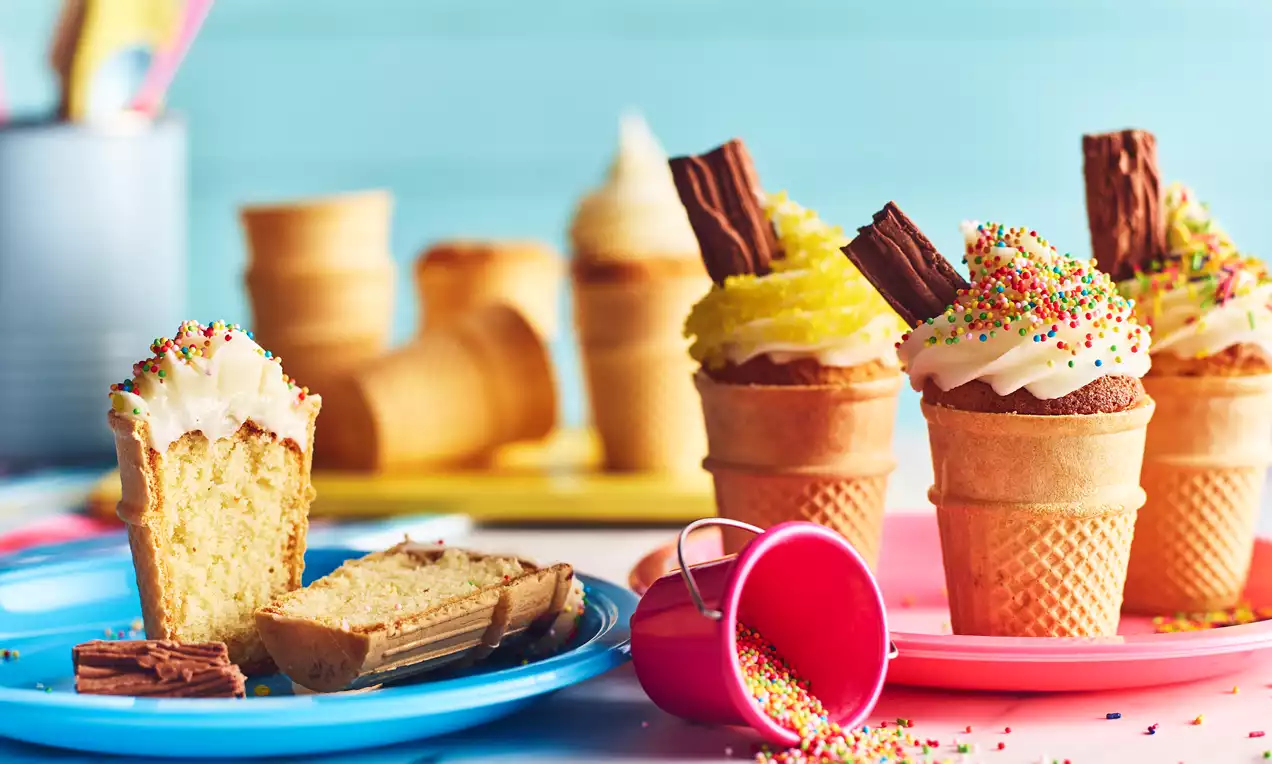 Divide the mixture into the ice-cream cones and bake for 15 - 20 minutes until well risen and firm to the touch. Remove from oven, leave to cool on a cooling rack.