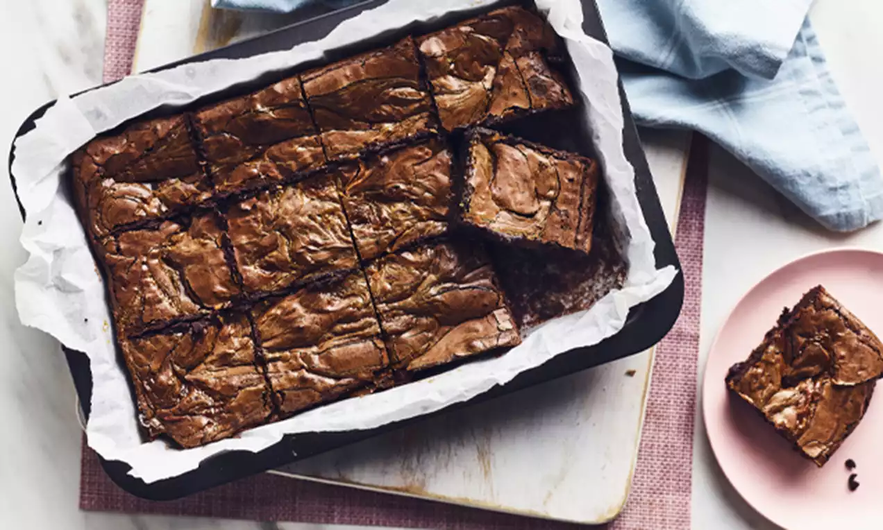 Bake for 30 minutes, until the edges of the brownie are firm and the middle has a very slight wobble. Leave the brownie to cool in the tin.