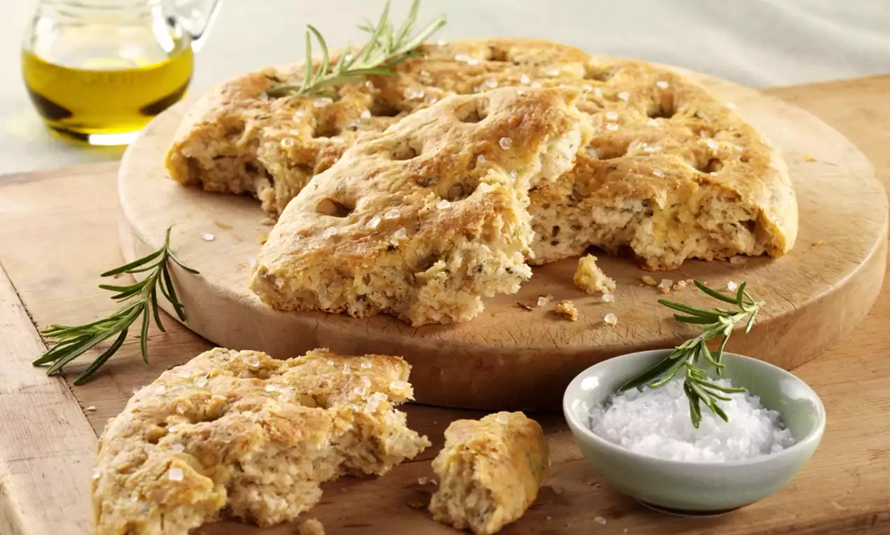 Drizzle with the remaining 15ml (1 tbsp) olive oil, sprinkle over the salt and bake in the oven for 20-25 minutes until risen, lightly golden and firm to the touch. As soon as the bread is cooked, spoon over the extra virgin olive oil and leave to cool in the tin for 20 minutes.